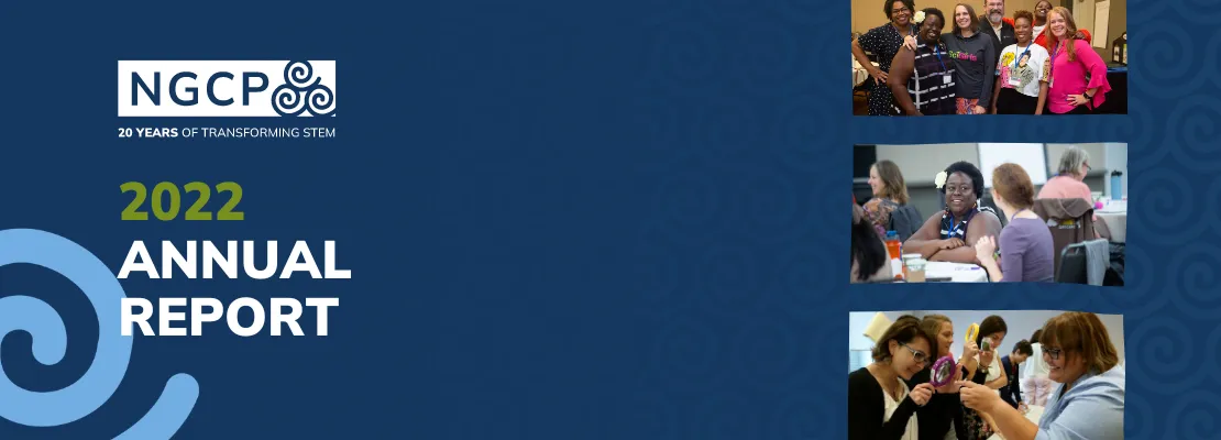The 2022 Annual Report celebrates NGCP's 20 Years of Transforming STEM. The report provides an overview of NGCP's wide-reaching impact through our state Collaboratives and diverse network projects, which deliver high-quality resources throughout the U.S. The report spotlights core activities, including the IF/THENĀ® Initiative, Leap into Science, and Million Girls Moonshot. It also highlights our 20th anniversary activities, Youth Advisory Board, Anniversary Fellowship program, #GirlsLeadSTEM campaign, NGCP's Strategic Direction, National Champions Board, and the Board of Directors.