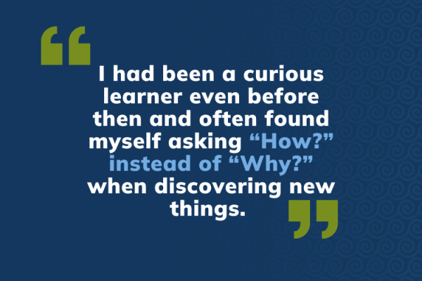 My STEM journey started in 6th grade, during a quiz when my science teacher slipped me a folded blue sheet of paper and told me not to open it until later. That day at lunch, I unfolded the mysterious note under the table and stared in surprise at the bold letters on the page. It was a flier for a countywide science fair.